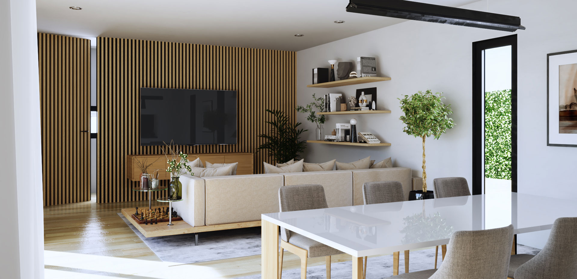 El corazón de la vivienda es su amplio salón-comedor, un espacio diáfano y versátil que integra armoniosamente las áreas de estar y comedor, ideal para compartir momentos en familia o con amigos. Grandes ventanales permiten la entrada de luz natural, realzando la sensación de amplitud y conectando el interior con el exterior. Un diseño moderno pensado para el confort y estilo de vida actual sin olvidarnos de un despacho para trabajo o estudio.